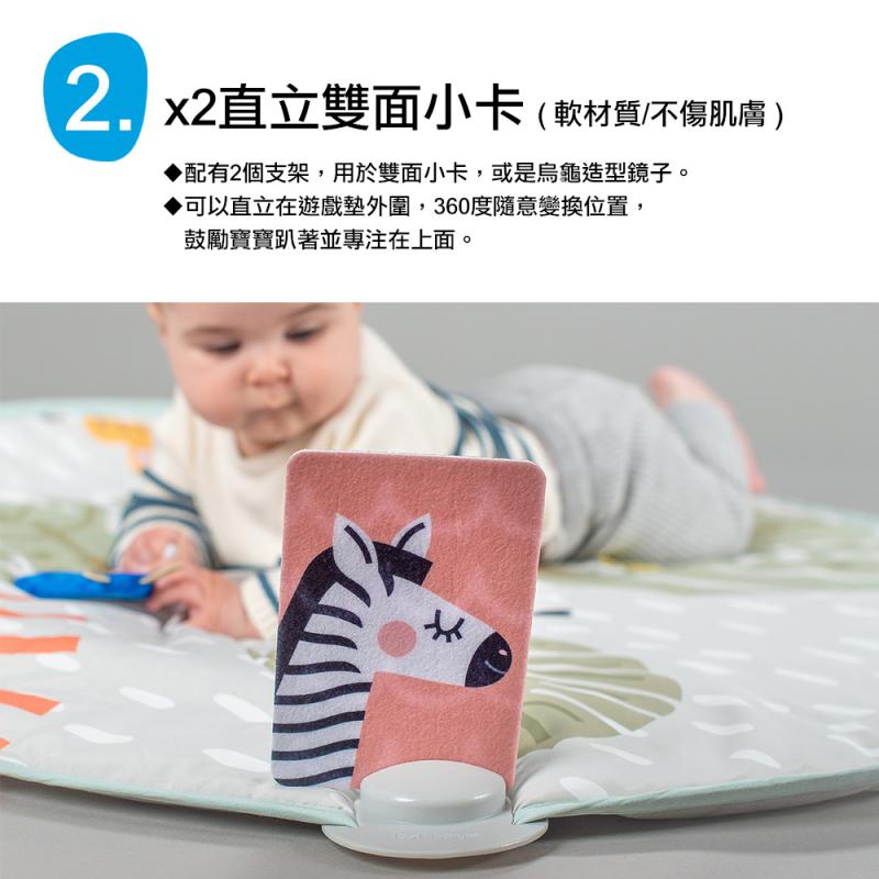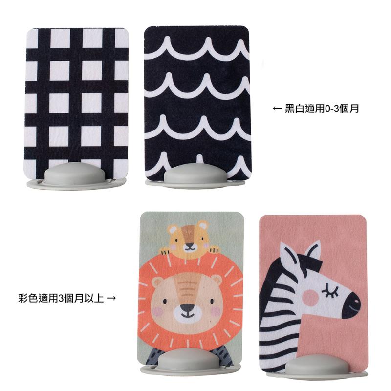 直立雙面小卡*2;分為黑白面與彩色面,配有支架,可用於雙面小卡,或烏龜造型鏡子,鼓勵寶寶趴著並集中注意力
