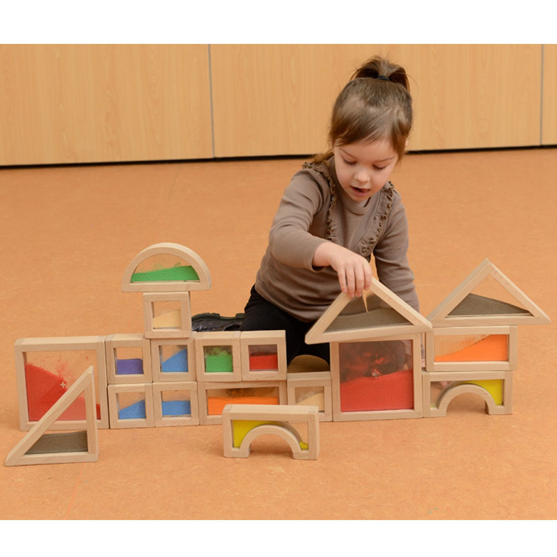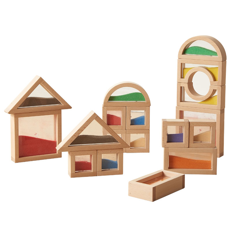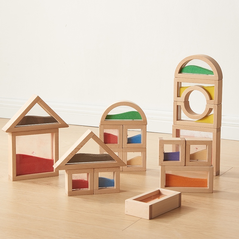 融入8種不同顏色細沙的天然北歐櫸木積木,增添了幼兒數學教育中對量和量的守恆認知。