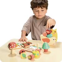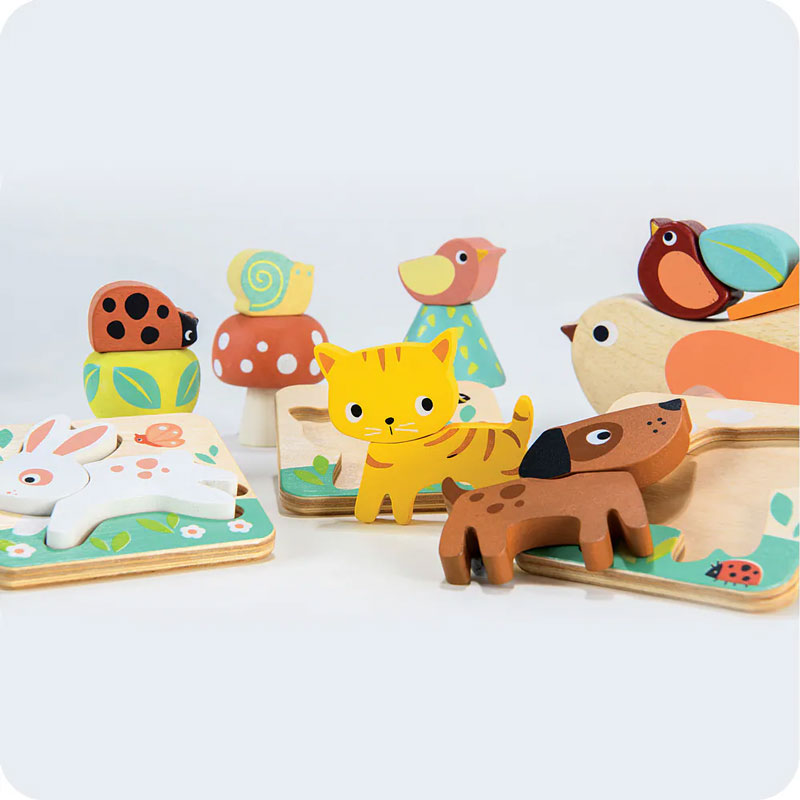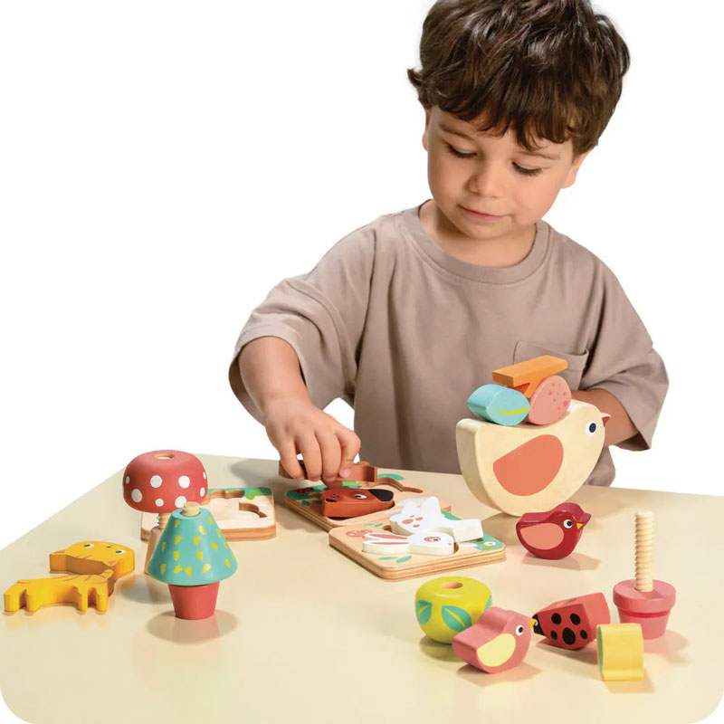 包含3組拼圖:小貓、小狗和小兔,每隻動物皆由2塊拼圖組成、3組疊疊樂:樹木和小鳥、花叢和瓢蟲與蘑菇和蝸牛,可讓孩子移動積木並組裝、1組小鳥疊疊樂,將樹葉、樹枝、蛋和幼鳥放到鳥媽媽的背上不落下,訓練小孩的手眼協調和平衡感。