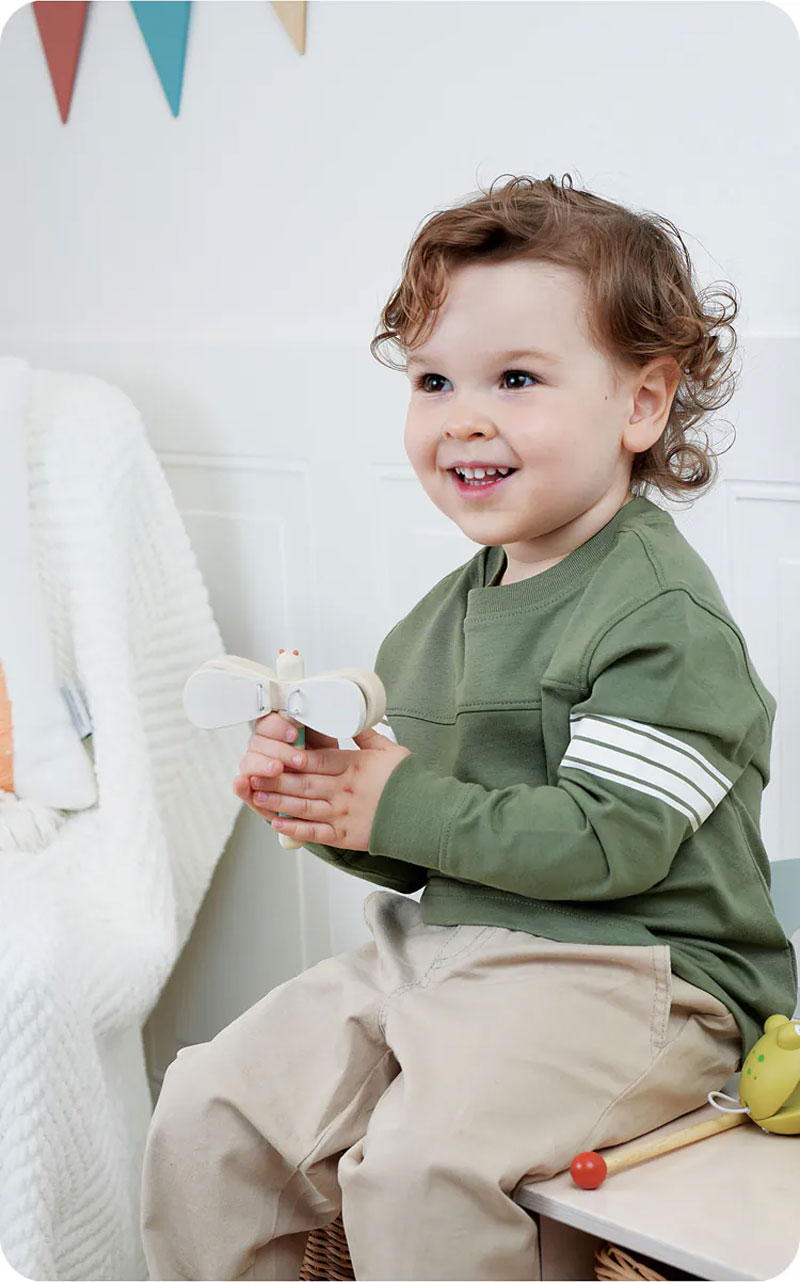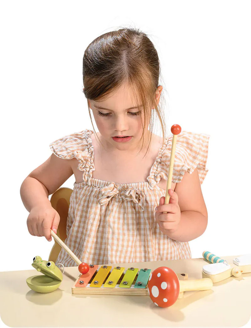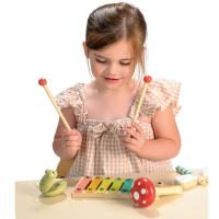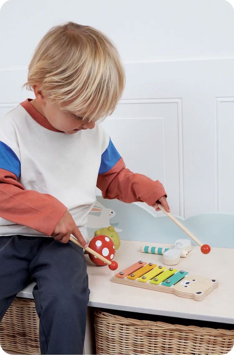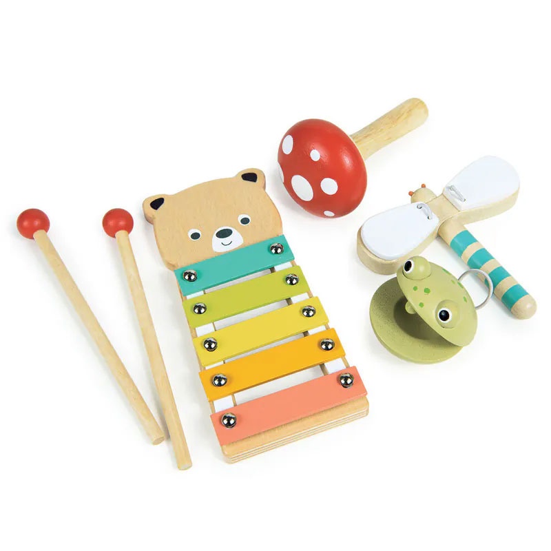 早教啟蒙樂器組,使用寶貝熊木琴、蜻蜓手響板、蘑菇沙鈴和嘓嘓青蛙響板,組成一支不來梅樂隊,用音樂啟發腦力和感受力。