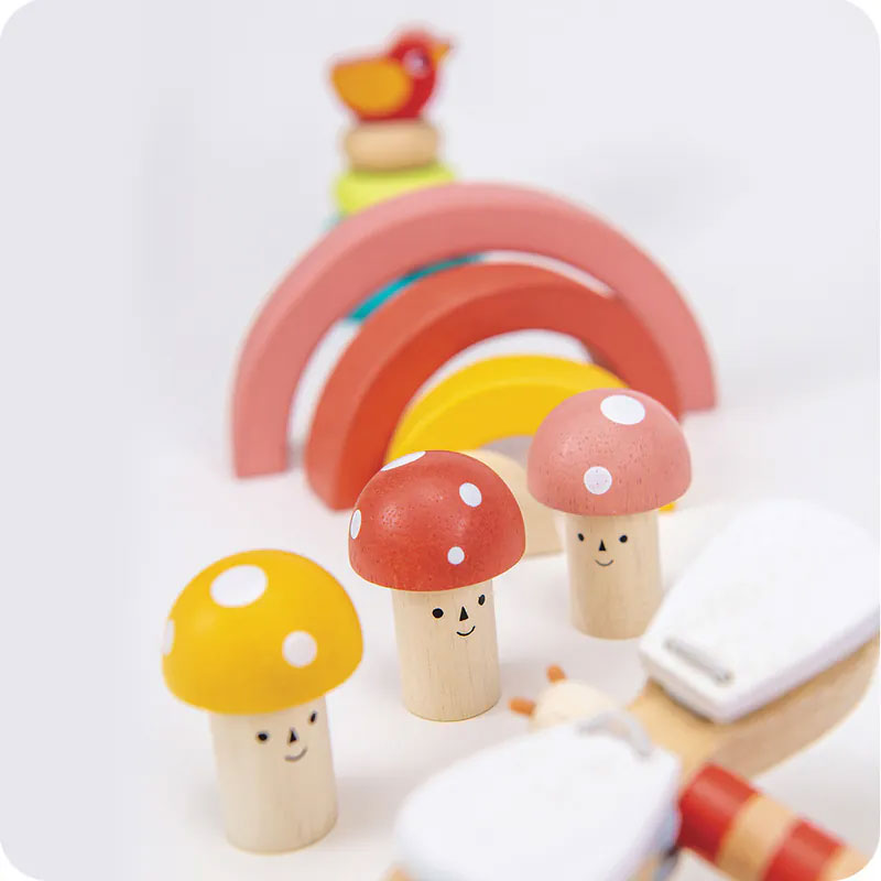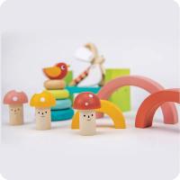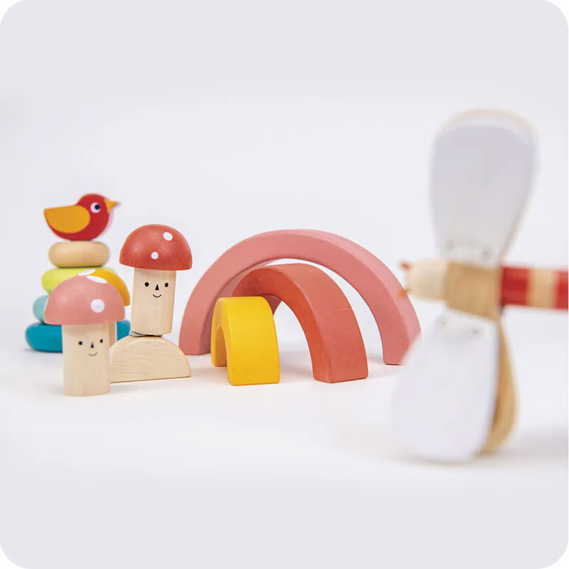 小鳥疊疊樹,訓練手眼協調;繽紛彩虹積木組,開放式玩法訓練建構能力;蘑菇敲敲樂,鍛鍊手腕的穩定度和蜻蜓手響板,提升音樂的感受力。
