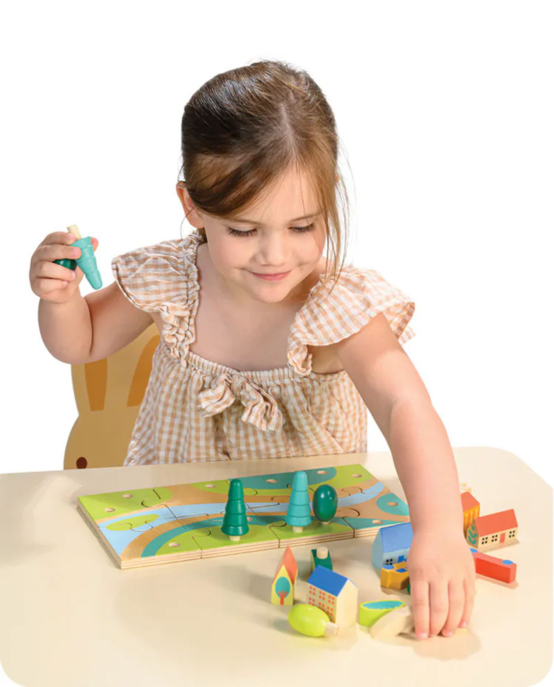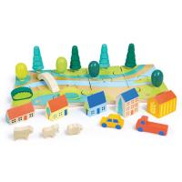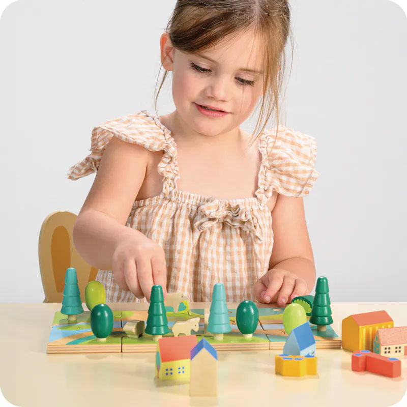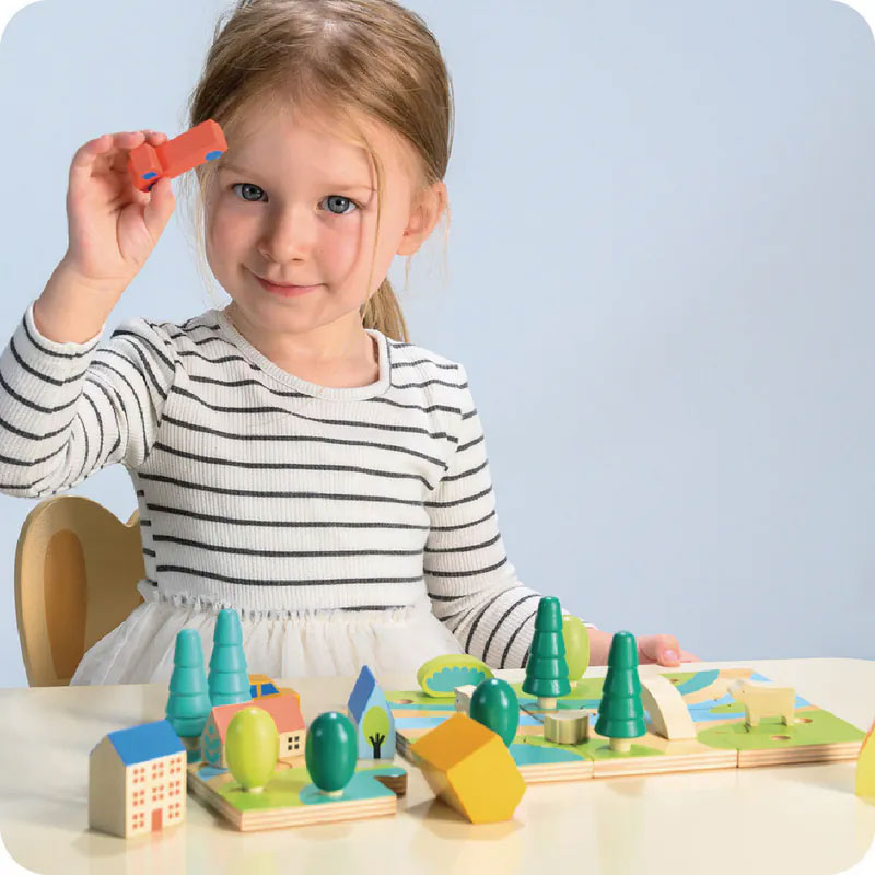 歡迎來到小小城鎮,這裡有8塊拼圖、5棟建築物、2輛車、8棵樹、2個灌木叢、1座橋和3隻農場動物。以拼圖的形式將小鎮拼組起來,再將樹木和灌木叢插在孔洞裡面。開放式的玩法,透過不同的建構風格編造屬於自己的城鎮故事,盡情發揮想像力和創造力。