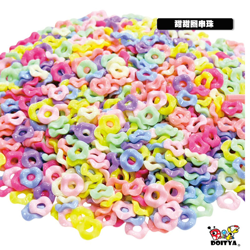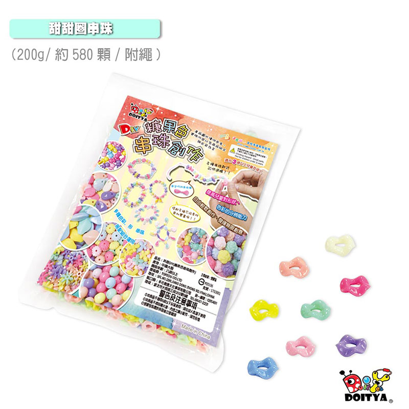 - 像糖果一樣誘人的甜甜圈造型,配上粉嫩的糖果色系,這款串珠不僅能做出超萌手鍊,更能結合黏土、繪畫等美勞素材!在穿繩與創作過程中,能有效提升孩子對色彩與形狀的分辨能力,快來發揮無限創意,打造專屬於你的糖果色飾品!