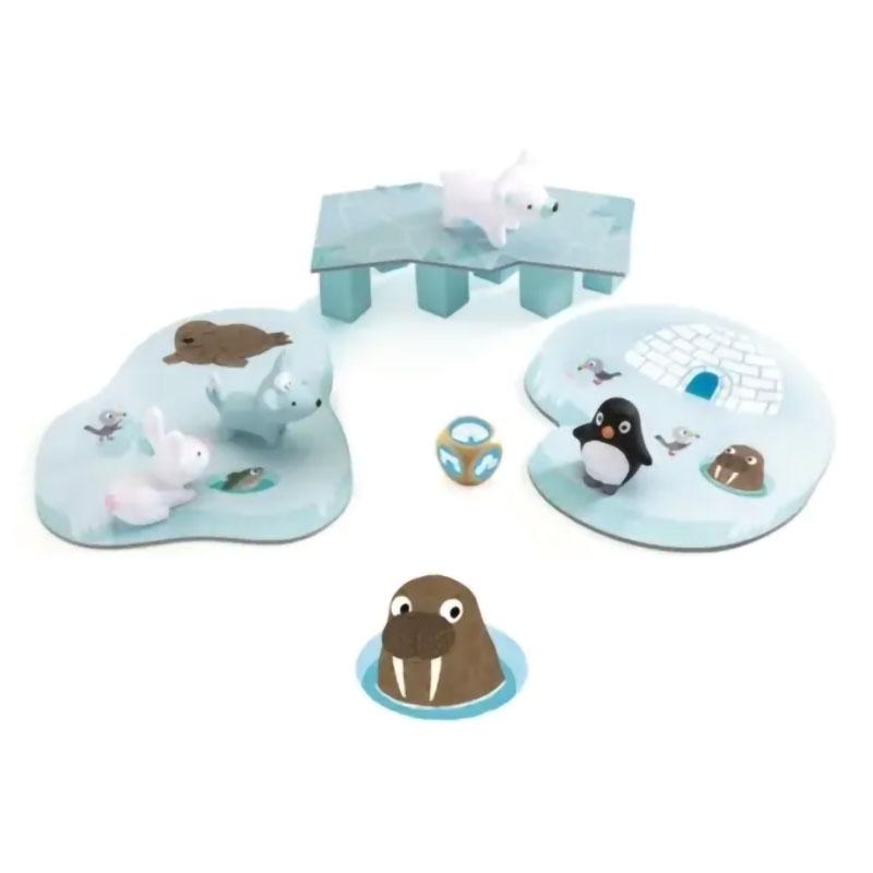 內容物 : 4隻小動物、3塊遊戲板(1塊「捕魚洞」開始板、1塊冰橋板、1塊「冰屋」目的地板)、6根冰橋柱子、1顆骰子