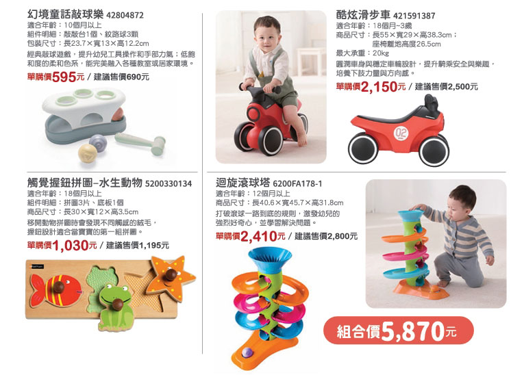 【童心園 春日號 - 托嬰托育特區】酷炫滑步車 + 幻境童話敲球樂 + 觸覺握鈕拼圖-水生動物 + 迴旋滾球塔