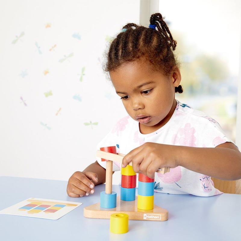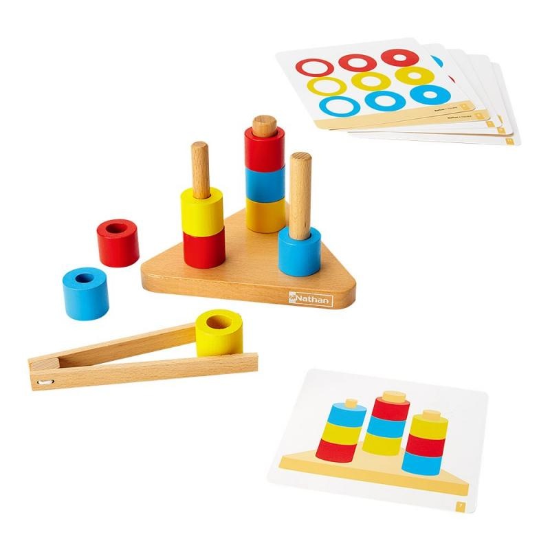 - 立正站好夾夾樂 : 夾取三種不同內徑的圓柱,對準套入底板中,練習進階的工具操作技巧;附6張雙面圖卡,提供顏色、大小及上下順序的配對挑戰。