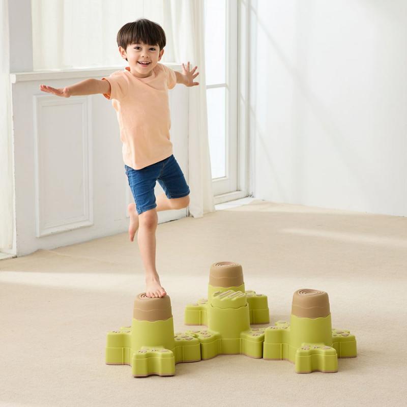 疊疊平衡樁 : 來趟好玩的森林健走之旅!穿越凹凸樹根、高低錯落的木樁和年輪,上下踩踏、大步跨越或小心轉向,時時考驗幼兒專注力,大幅提升下肢力氣和踝關節靈活度。