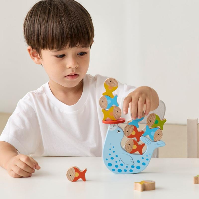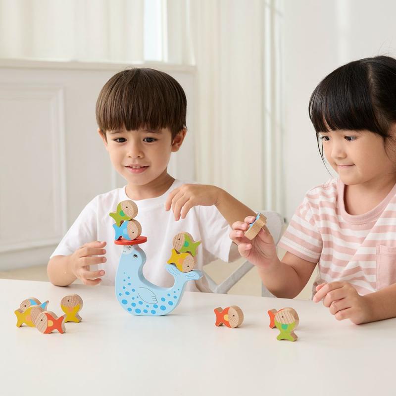 海豹疊疊樂 : 將小魚依序堆疊在小小的紅色平台或海豹尾巴上,並取得兩端平衡。