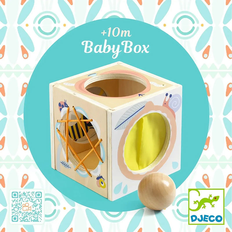 寶寶可以探索將球藏在盒子裡的 4 種不同方法,將球藏在盒子裡面:穿過鬆緊帶,打開小門,穿過大孔,甚至穿過大的彈性織物,令人驚訝的是:球消失了。然後他們把它拿回來並重新開始。