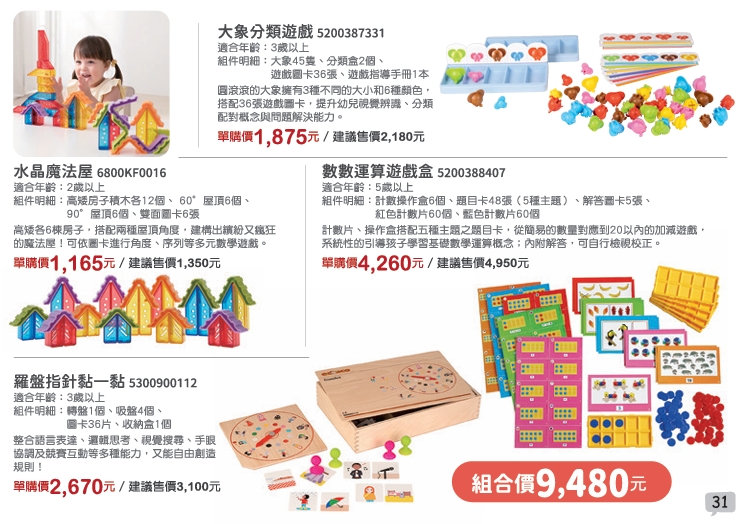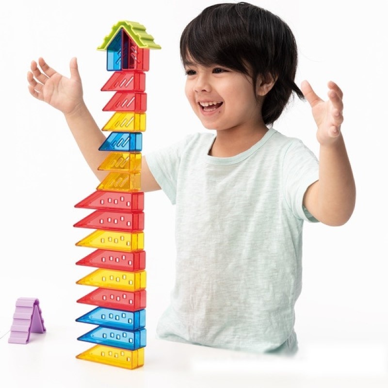 - 水晶魔法屋 : 由6棟高房子,6棟矮房子,搭配兩種屋頂角度,不論各種瘋狂組合,都能建構出繽紛又獨特的魔法屋!還能觀察透明與混色的光影變化,或依圖卡進行角度、序列等數學遊戲,多元的功能,百玩不膩!