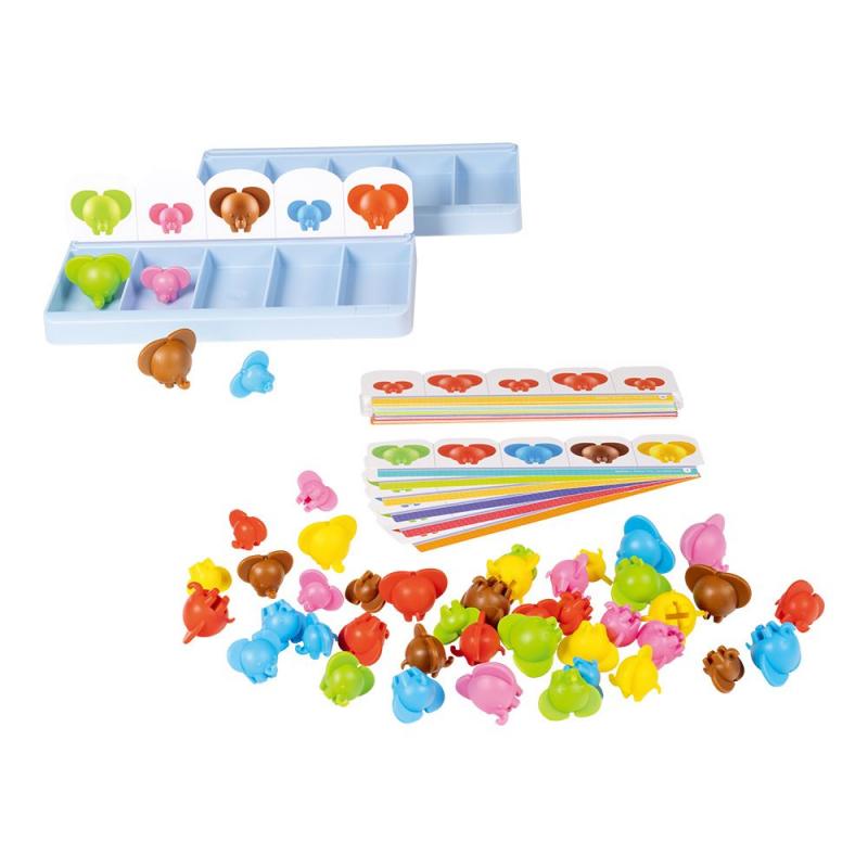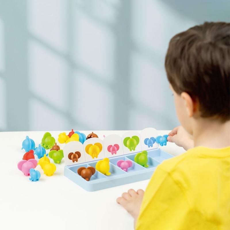 大象分類遊戲 : 圓滾滾的大象擁有3種不同的大小和6種顏色,搭配36張遊戲圖卡,提升幼兒視覺辨識、分類配對概念與問題解決能力。