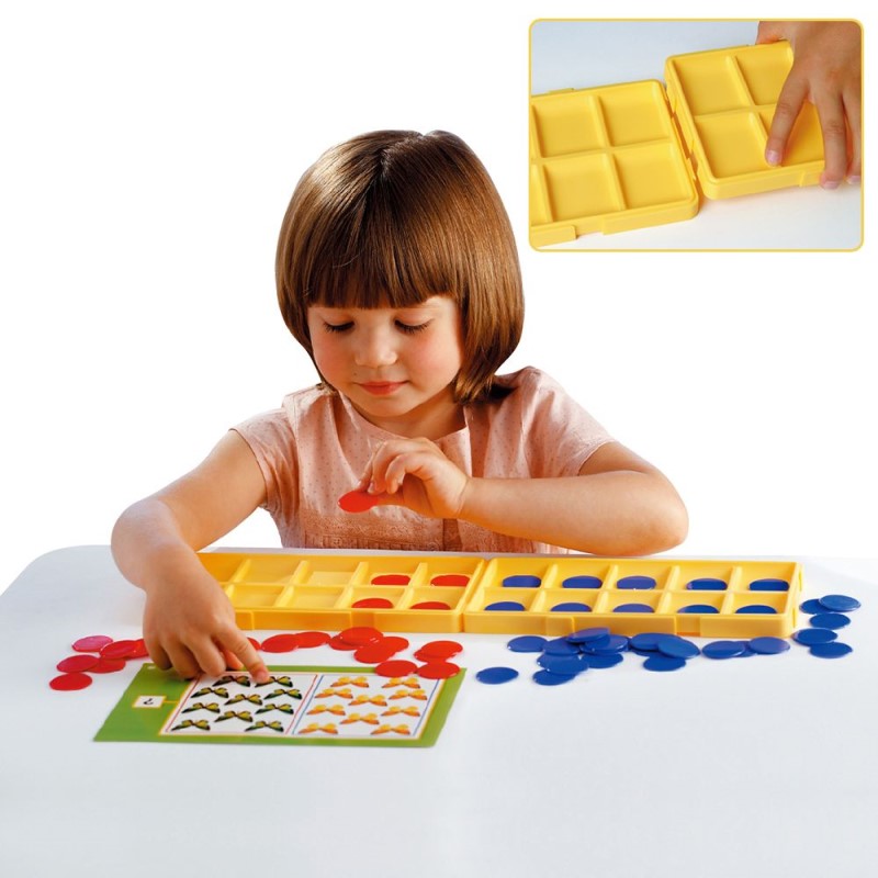 •每個操作盒上有10個格子,6個操作盒共有60個,搭配紅、藍色計數片,可練習0-60間的數數遊戲。
