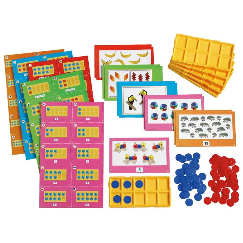 數數運算遊戲盒 : 計數片、操作盒搭配五種主題之題目卡,從簡易的數量對應到20以內的加減遊戲,系統性的引導孩子學習基礎數學運算概念。