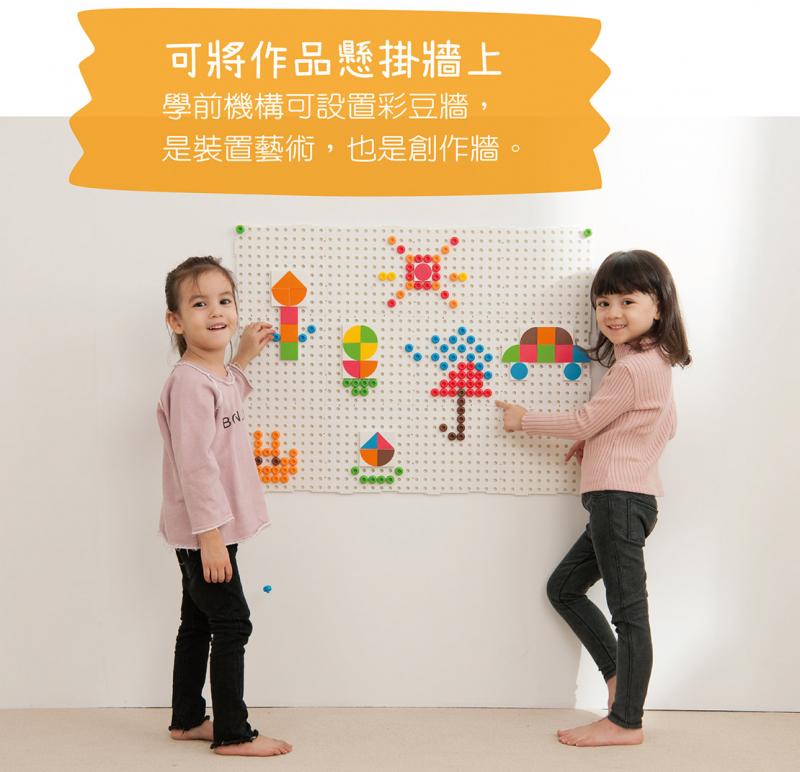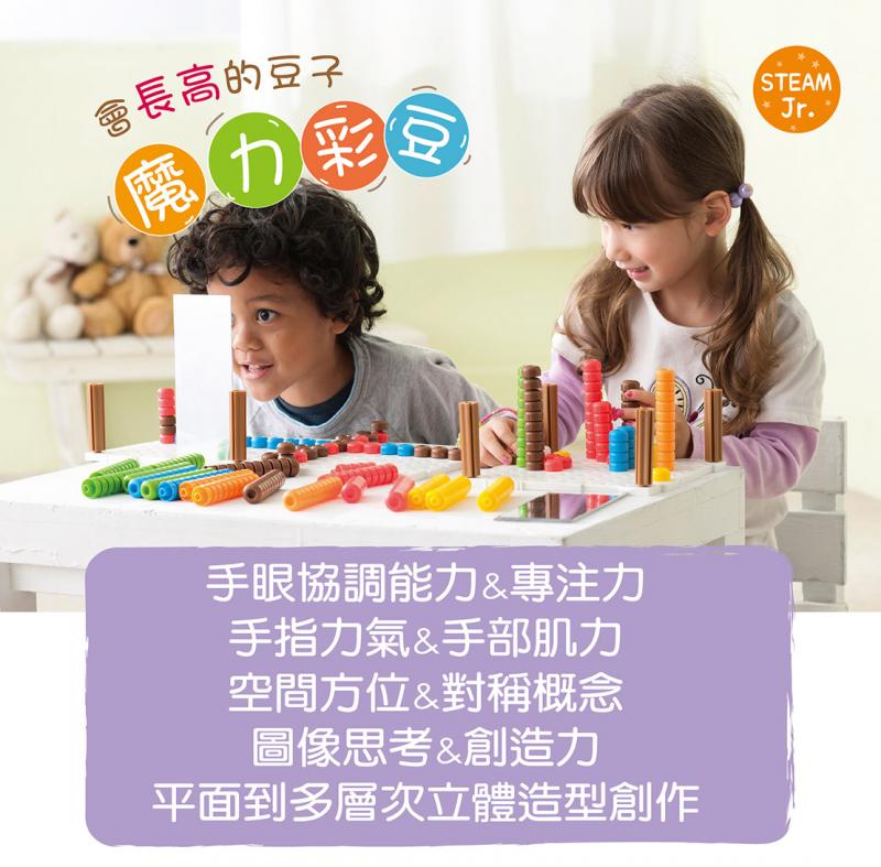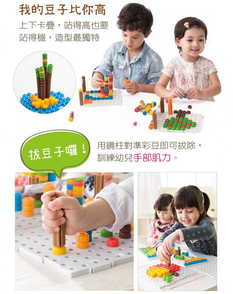 •彩豆可以上下堆疊,呈現2D和3D多元表現,培養幼兒圖像組織和思考能力。