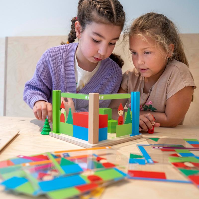 解構視角解謎遊戲 : 運用前視圖及側視圖兩種視角,將平面圖卡變成立體的積木建構,有助於幼兒逐步建立三維空間概念。