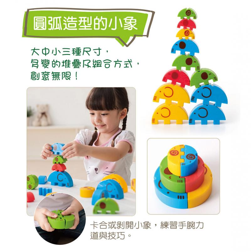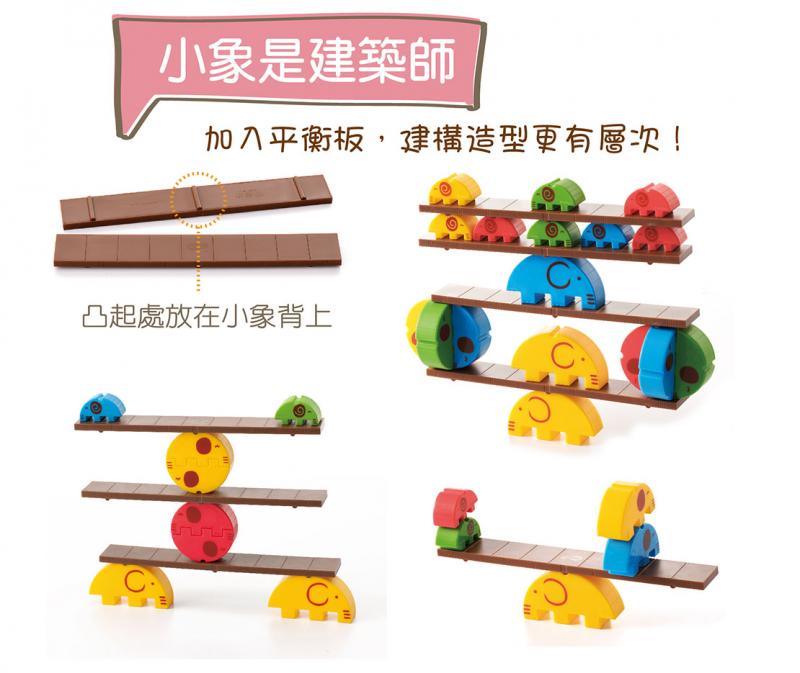 •小象半圓設計,可單獨堆疊也可在平衡板上堆疊,培養手部穩定度,增進專注力。