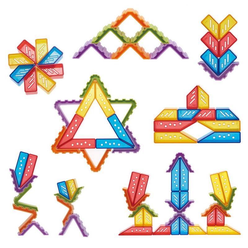 - 水晶魔法屋 : 由6棟高房子,6棟矮房子,搭配兩種屋頂角度,不論各種瘋狂組合,都能建構出繽紛又獨特的魔法屋!還能觀察透明與混色的光影變化,或依圖卡進行角度、序列等數學遊戲,多元的功能,百玩不膩!