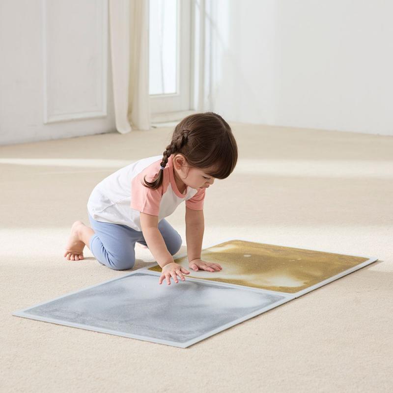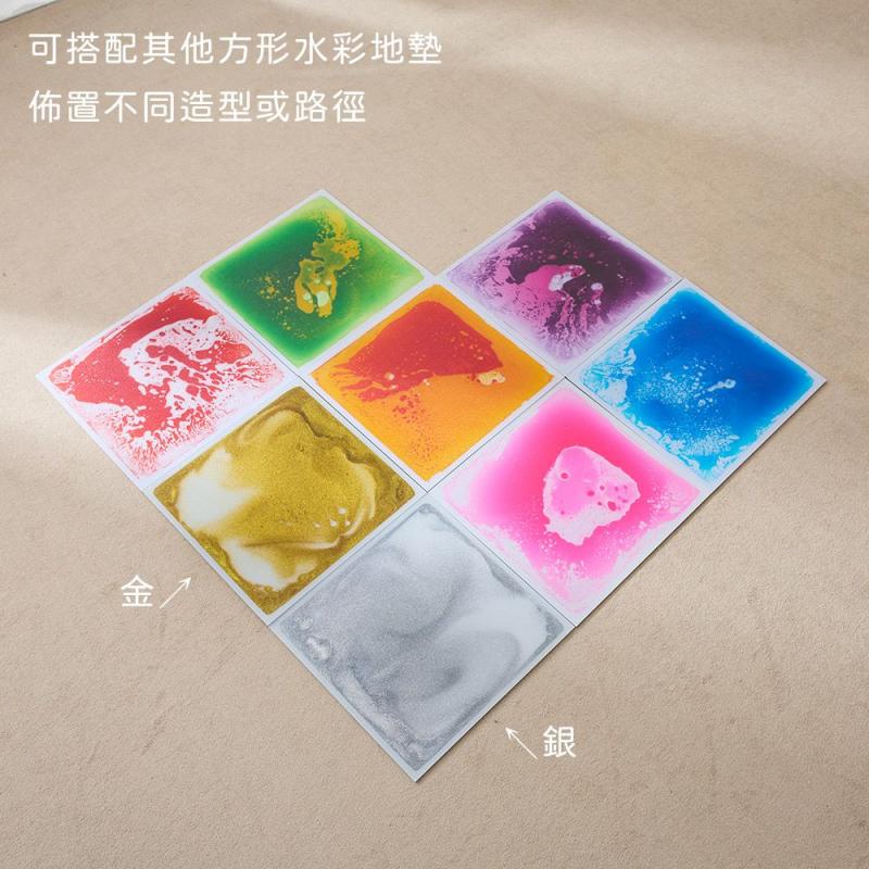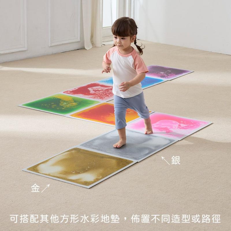 水彩地墊-金沙 : 地墊中緩緩流動的金銀亮粉,踩踏按壓帶來有趣的視覺效果。適合爬行或學步的小寶寶,也適合大孩子藝術或律動課程使用!